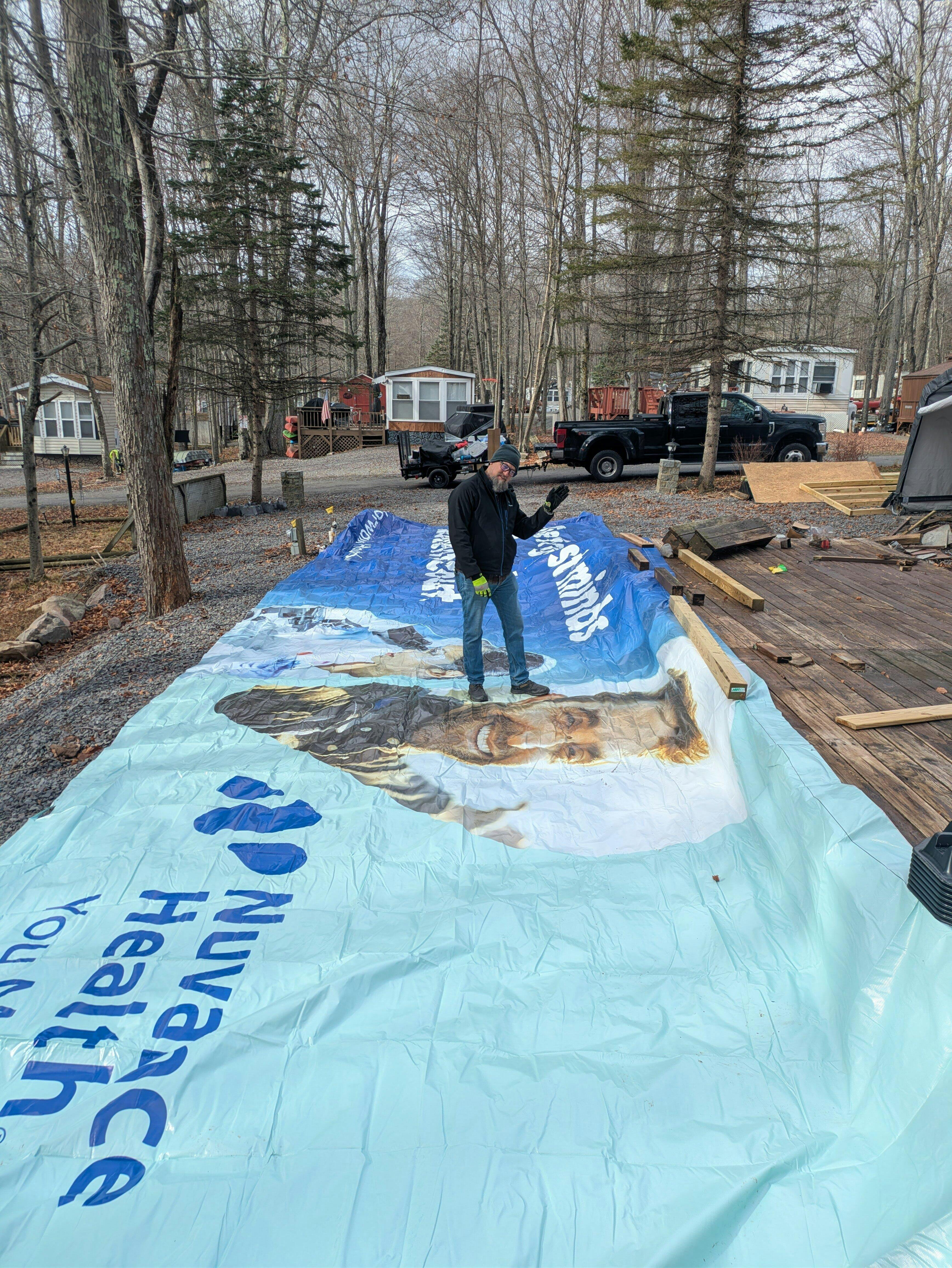 These billboard vinyls were once advertisements on a billboard and can now be used as tarps, coverings, awnings, pond liners, RV covers, and more. These vinyls are made of heavy-duty, water-resistant, UV protected PVC coated vinyl.